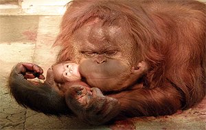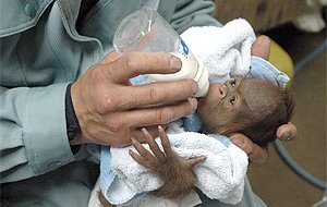 | 神戸市立王子動物園で飼育展示していますメスのボルネオオランウータン「バレンタイン」(23歳)が2009年(平成21年)4月2日(木)に赤ちゃんを出産しました。出産後、しばらく様子を見ていましたが、母親から授乳することができないため、現在は人工哺育を行っています。父親は2007年12月に福岡市動物園から繁殖目的で借り入れ(BL:ブリーディングローン)をしていたオスのオランウータン「ミミ」で、2008年8月に2頭の間で自然交配を行い、妊娠・出産に成功しました。なお、父親の「ミミ」は今年3月に繁殖目的で大阪市天王寺動物園へ移動しており、現在は王子動物園にはおりません。 国内血統登録書によると日本でのオランウータンの出産例は過去に76例あり、今回の出産は2007年の旭山動物園での出産以来、約1年8ヶ月ぶり77例目となります。なお、王子動物園でオランウータンの出産に成功したのは初めてです。 当分の間、オランウータンは母子共に非公開となり、現在のところ公開時期は未定です。 |