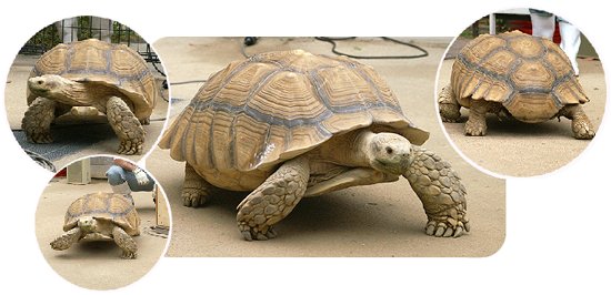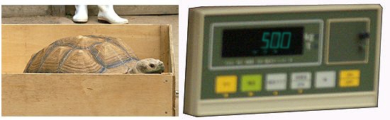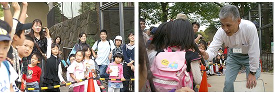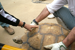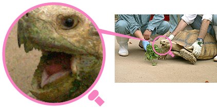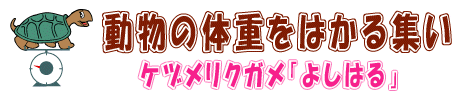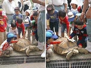 体重測定会場で、大きな甲羅を背負って活発に歩き回る「よしはる」は、集まった子ども達の人気者。