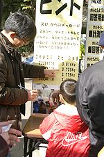 ![]() 雨のため11月3日に順延された「ズゼ」の体重をはかる集いを見ようと、祝日のゾウ舎前は開始前から多くのギャラリーで大賑わい。 投票箱前には「ズゼ」の成長記録である過去の体重が貼り出され、それをヒントに親子やカップルが相談しながら予想体重を投票し、正解者には素敵な賞品が当たる人気の行事です。 |