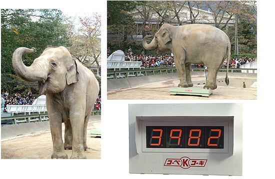 会場の運動場には特大の体重計が設置され、主役の「ズゼ」が登場。飼育員の号令で鼻を上げながら口を開けるポーズを決めた後、ゆっくりと体重計に乗り、表示された体重は3,982kgで昨年より168kgの増加!!