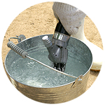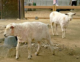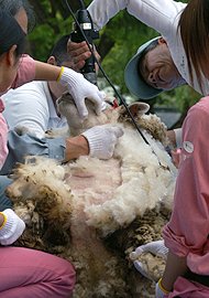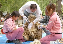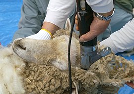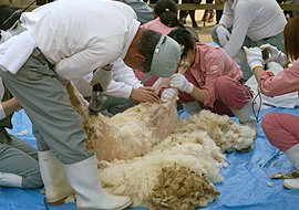 今年も主役は、コリデール種の「メエ」(7歳)と「テン」(9歳)。1年間でモコモコに伸びた毛を、歯の大きさが約7cmもある大きなバリカンで刈っていきます。ヒツジの皮膚は非常にたるんでいるので、バリカンで傷つけない為にも片手で皮膚を引っ張りながら慎重に、しかも密集した毛には「ラノリン」という油がついているので、バリカンに付着した油を何度もお湯で洗い流しながら進めていきます。 そのバリカンは重く、中腰での作業は、飼育員にとって技術と忍耐のいる作業です。 そして何より一番忍耐を必要とするのは、無事に毛刈りが終わるまでの約40分間、体を拘束される2頭のヒツジたちです。 |