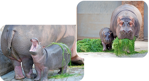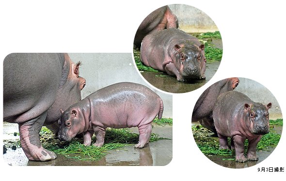 | 当園では、8月に誕生したカバの赤ちゃんを10月13日(火)より一般公開します。当園でのカバの誕生は約20年ぶりです。 赤ちゃんは8月11日の朝に誕生しましたが、これまでは母親の「ナミコ」が育児に専念できるように、母子ともに非公開としてきました。その後、赤ちゃんは母親のミルクを飲んで、順調に成長しており、また生後2ヶ月を経過し、落ち着いていることから、一般公開をすることになりました。 現在のところ、赤ちゃんの性別は不明ですが、判明後には園内において名前の公募も予定しています。 |