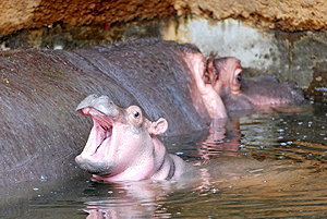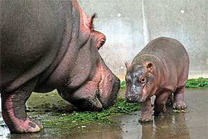 | 当園のメスのカバ「ナミコ」が2009年(平成21年)8月11日の朝に赤ちゃんを無事に出産しました。当園では、「ナミコ」の前に飼育していた「茶目子」が1989年11月に出産して以来、約20年ぶりの繁殖で、「ナミコ」の出産成功は初めてです。 母親の「ナミコ」が初めての育児に神経質になっているため、飼育員もエサやりのとき以外は近寄らず、監視カメラによる観察を続けています。監視カメラの映像で、赤ちゃんはカバ舎屋内飼育場で母親に寄り添い、プール内で母乳をもらっている様子も観察されており、元気に育っています。 当分の間は、カバ舎屋内展示場を閉鎖していますので、母子共にご覧になることはできません。公開時期は未定ですが、できるだけ早くに元気な赤ちゃんを皆さんに見ていただけるようにしたいと思います。 |