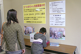 | 今年8月11日に誕生したカバの赤ちゃんの名前を募集します。園内のカバ舎に投票箱を設置し、動物園が選んだ4つの候補のうち、1つを来園者に選んでもらい、一番たくさん投票された名前に決定します。 赤ちゃんは誕生後、母親が育児に専念できるように非公開でしたが、10月13日より一般公開を始め、 現在では屋外プール又は屋内プールで母親の「ナミコ」と一緒に公開しています。「ナミコ」も落ち着いて育児をしており、赤ちゃんは順調に成長し、体重は誕生後約4ヶ月で推定150kg以上になりました。投票期間は12月12日(土)〜23日(水・祝)で、決定した名前は12月25日(金)に、園内のカバ舎とホームページで発表します。 |