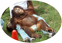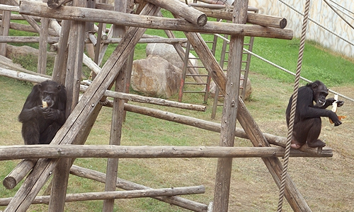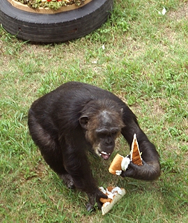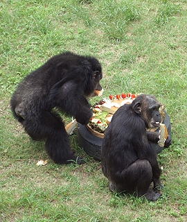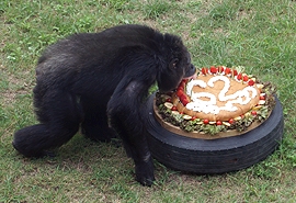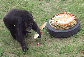 9/17、国内最高齢のチンパンジー「ジョニー」に、敬老の日のお祝い会が開催されました。![]() ケーキの準備までの間、人工飼育中のオランウータンの「ムム」が飼育員と登場し、かわいらしさをふりまいていました。 |