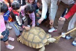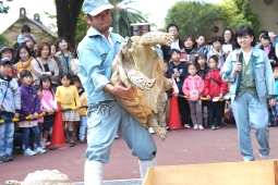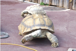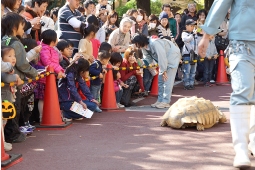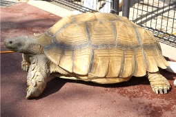 乗れないことはないですが、上から押さえられる力には弱くて、手や足を痛める事があります。太陽の動物舎前には「よしはる」の甲羅を測って作った「よしはる」そっくりなオブジェがありますので、その上に乗って実感してみてください。 |
