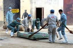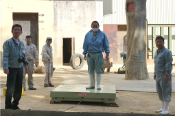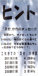 次の「よしはる」は、飼育員が抱えて測定箱に入れるのも重そうな様子。 計測された体重は60kg、昨年より0.5kgだけの増量でした。 |