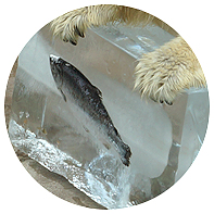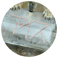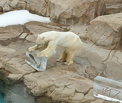 ![]() 「鮭」「ウインナー」「牛骨」、「リンゴ」入りの色鮮やかな氷(幅100cm×高さ56cm)が並べられ、ゆっくりと全ての氷を確認後、「アイス」が第1番目に選んだのが「鮭」入りの氷。 大きな前足で氷を抱え込むように倒して粉砕し、鋭いキバでお目当ての「鮭」に挑んでいきます。 多くのギャラリーはタオルで流れる汗をぬぐいながら、辛抱強くその様子を見守っていました。 |