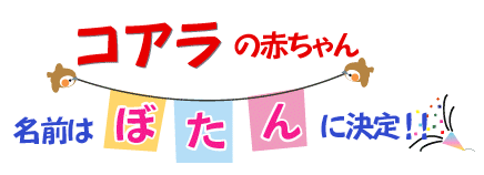 | メスのコアラの名前が「ぼたん」に決まりました。 12日間で1,730票の投票をいただきました。 ※投票結果 ぼたん ― 1,031票 ビューティー ― 359票 べっぴん ― 304票 無効票 ― 36票 |