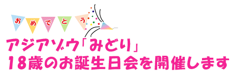 10月7日(日)に、宮崎市フェニックス自然動物園から来園しているアジアゾウ「みどり」の18歳のお誕生日会を開催いたします。宮崎市フェニックス自然動物園と王子動物園が用意した果物を豪華に盛り付け、プレゼントします(マックとズゼにもおすそ分けがあります!)。 みどりとともに宮崎からやって来た飼育係によるゾウの解説や「みんなで歌おうハッピーバースデイ」のコーナーもあります。 |