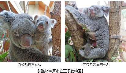 | 5月に誕生したコアラの赤ちゃん2頭が、お母さんのおなかの袋から顔を出し始めています。 母子ともにコアラ舎の展示場で公開中ですが、赤ちゃんはまだお母さんのおなかの袋に入っていることが多く、ご覧いただけないことがあります。 当園で飼育しているコアラは、赤ちゃんを含めて8頭になりました。赤ちゃんの名前は後日、来園者の方から募集する予定です。 ![]() |