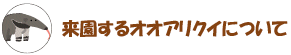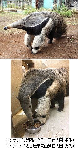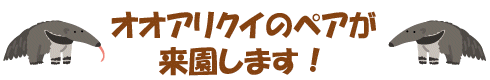 5月25日(月)にオオアリクイが来園します。 静岡市立日本平動物園からオスの「ブンバ」、名古屋市東山動植物園からメスの「サニー」が来園し、将来は2頭で繁殖に取り組んでいきます。 2頭は環境に慣れるまでは非公開となります。 動物園が開園し、オオアリクイ2頭も公開できるようになればホームページ等でご案内します。 |