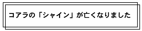 | 2022年1月6日、コアラの「シャイン」(オス、4歳)が亡くなりましたので、謹んでお知らせします。 「シャイン」は2019年に埼玉県こども動物自然公園から来園し、愛らしい表情や寝相、時々屋外でくつろぐ姿が来園者の皆様に愛されていました。昨年には「マイ」(メス、2歳)との繁殖に成功し、待望の赤ちゃんの誕生で皆に喜びを運んできてくれました。 その矢先の昨年末にリンパ腫の疑いがあり、治療に努めてきましたが、残念ながら治療の甲斐なく亡くなりました。 これまで多くの方々に可愛がっていただきましたことに、お礼を申し上げますとともに、「シャイン」に感謝の気持ちを表します。 |