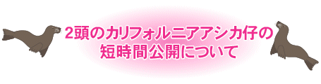 | 昨年6月に生まれたカリフォルニアアシカの仔2頭は、現在、ペンギン舎屋内展示場にて、離乳のためのトレーニングをしています。 しっかり魚を食べられるようになってきましたので、この度、下記により短時間公開します。 今後、さらに安定して魚を食べられるようになれば、2頭はアシカ池に戻る予定です。 |